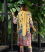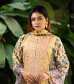 This 3-piece embroidered cotton salwar kameez features delicate embroidery on the chest, enhanced with subtle digital print for a refined and feminine appearance. The round shape cut collar and full sleeves give a modest and classic touch, while the coordinated Reon orna completes the ensemble with a polished look.