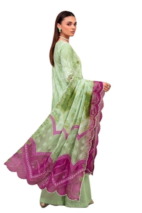 The dupatta, in lightweight printed lawn/voile, features a flowing gradient floral design with baby blue and pink dominant tones, adding movement and grace to your ensemble.