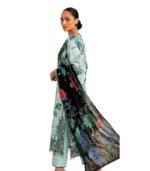 Floral digital prints in deep green and blue extend across the shirt, adding visual depth and balance. The embroidered hem border refines the overall finish. A black floral printed chiffon or silk dupatta completes the look with fluid elegance, paired with a dyed light teal cotton trouser for coordinated styling.