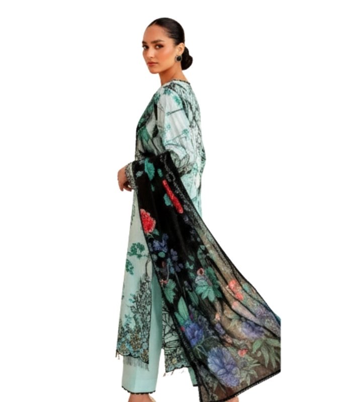 Teal & Black Floral Digital Printed Embroidered Unstitched Lawn 3 Piece Suit combines refreshing light teal tones with a dramatic black contrast panel. The embroidered front neckline enhances the upper bodice, while the heavy printed black side panel creates a striking modern silhouette.