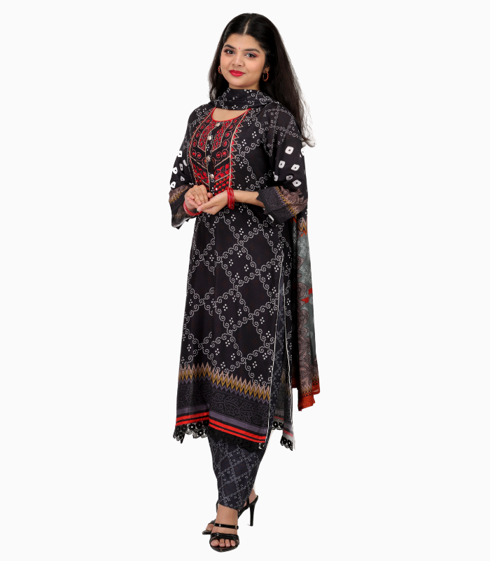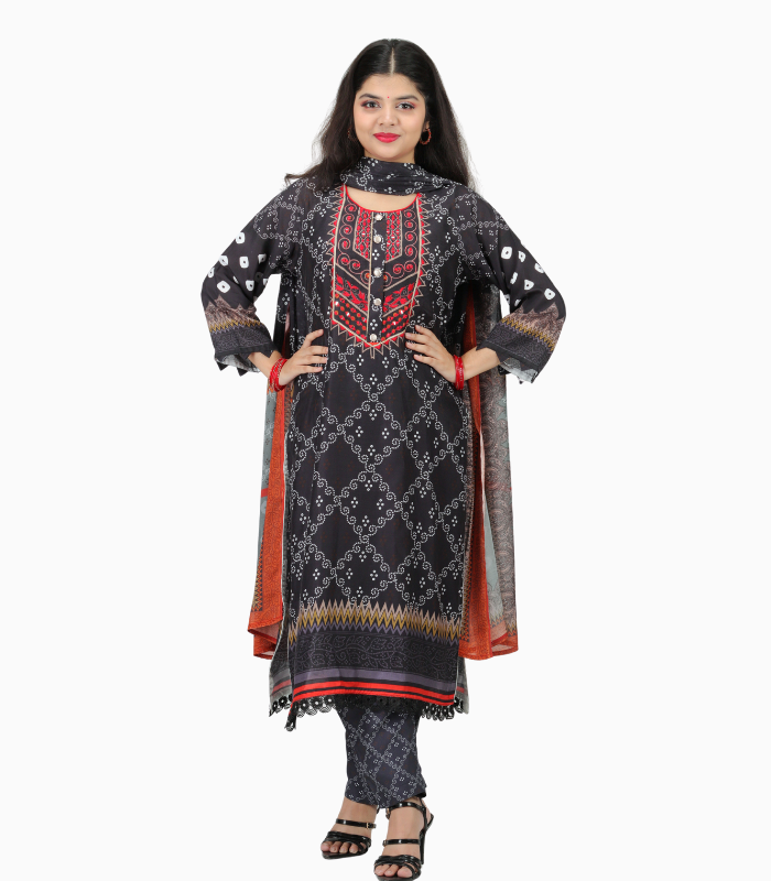 Step into elegance with the Black Shalwar Kamiz from BD Made Fashion. This timeless outfit combines classic design with modern detailing, making it ideal for festive gatherings, family celebrations, or formal events. Featuring delicate chest embroidery and stylish front buttons with digital print, this embroidered black shalwar kamiz adds sophistication and charm to your wardrobe.