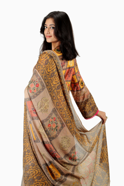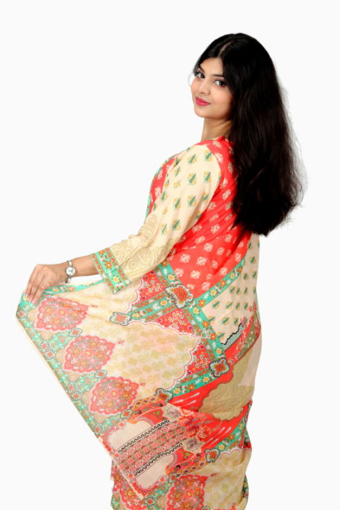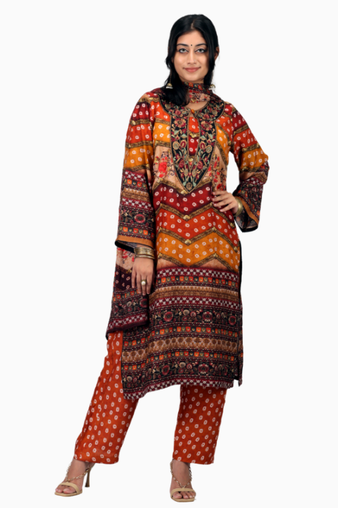 Crafted from premium Reon/viscose fabric, this shalwar kamiz is soft, lightweight, and breathable, ensuring comfort for all-day wear. The accompanying AC cotton pants with elastic waistband allow freedom of movement, while the matching Reon orna completes a polished traditional look. Every detail is carefully designed to offer women’s festive shalwar kamiz that combines elegance with practicality.