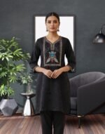 This designer kurti BD collection is crafted from high-quality silk fabric, offering a smooth, soft, and slightly glossy finish. The classic black shade gives a powerful and graceful appearance, while the breathable texture ensures comfortable wear for long occasions. Whether you’re attending a wedding, Eid celebration, evening party, or formal gathering, this outfit guarantees a stunning and confident look.