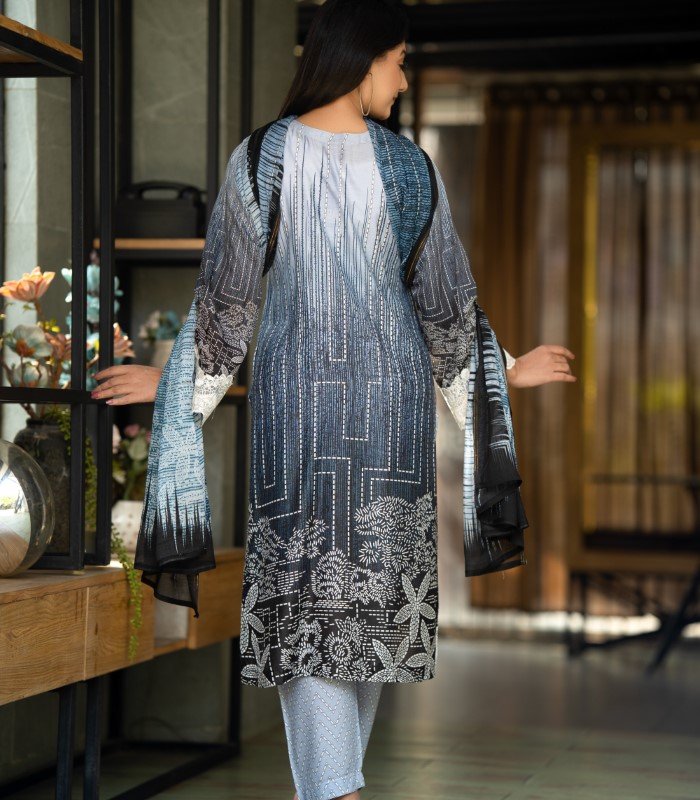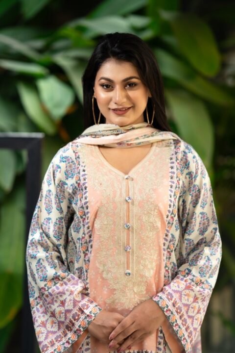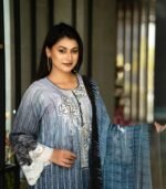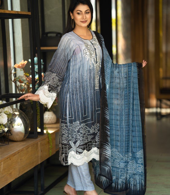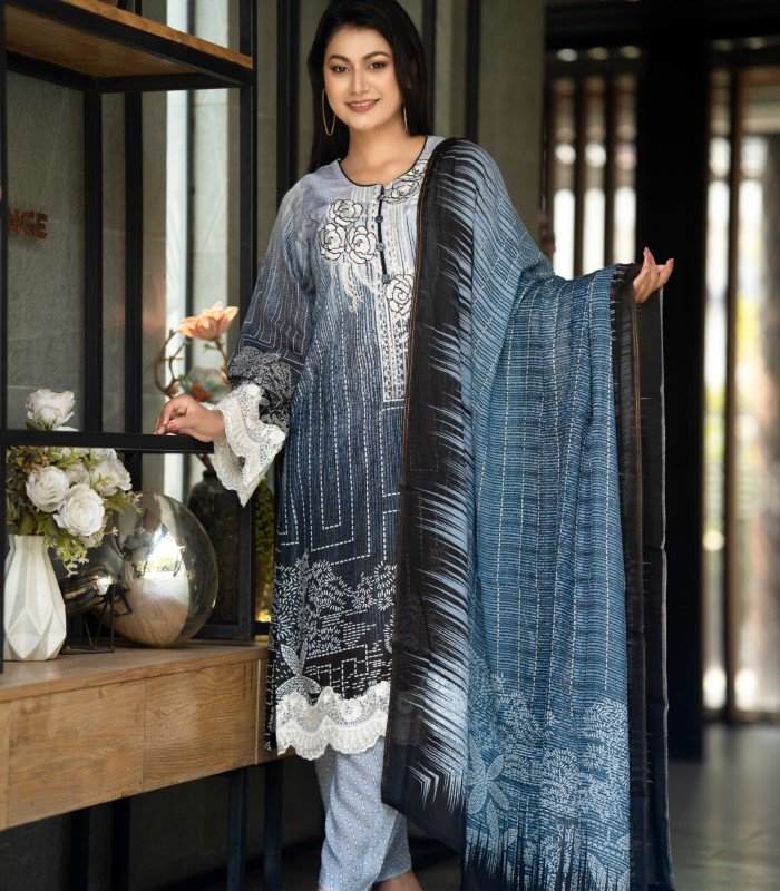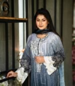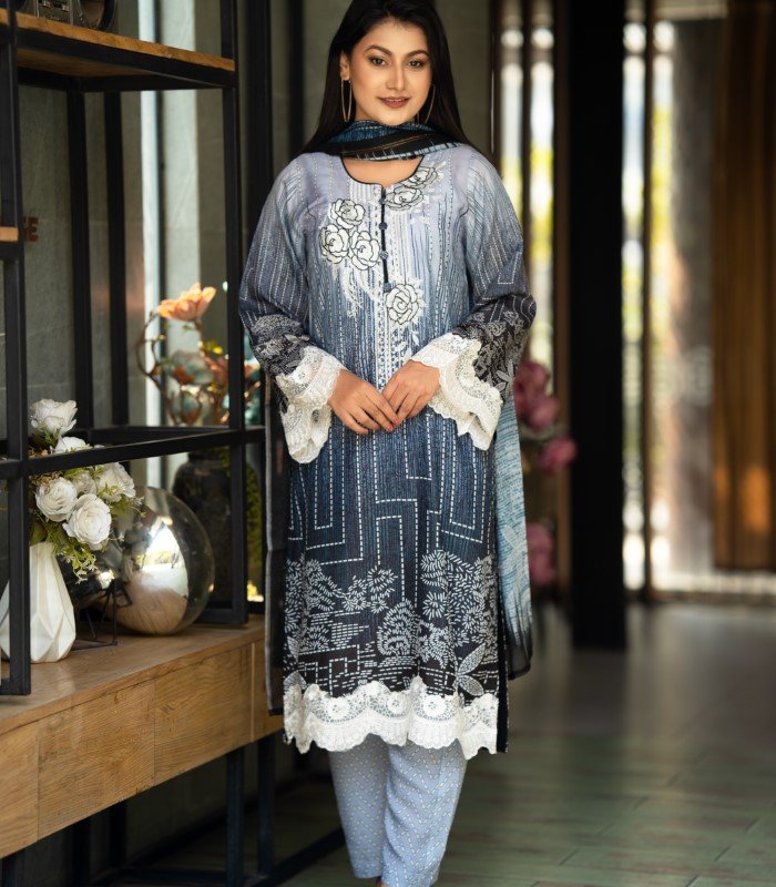 It features embroidered work on the kameez chest, complemented by attached embroidery on the lower kameez and sleeves, enhanced with a digital printed design. A matching Reon orna completes the look, making this Blue Rose Embroidery Salwar Kameez an ideal choice for graceful daily styling.