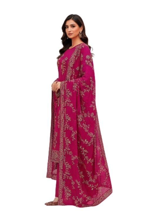 Blush Pink Floral Embroidered Unstitched Lawn 3 Piece Suit combines soft feminine tones with detailed vertical embroidery. The delicate floral border design enhances the hemline, adding refined structure.