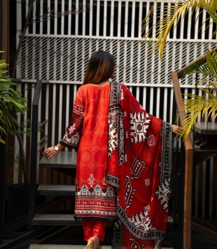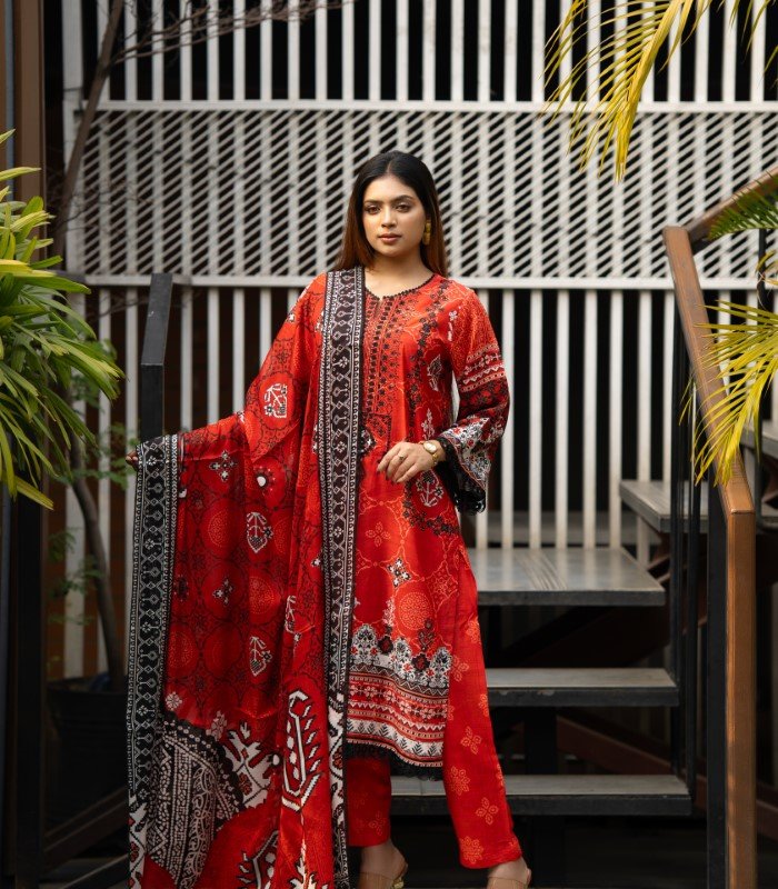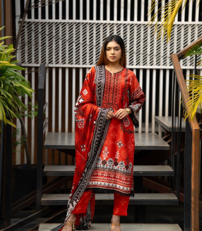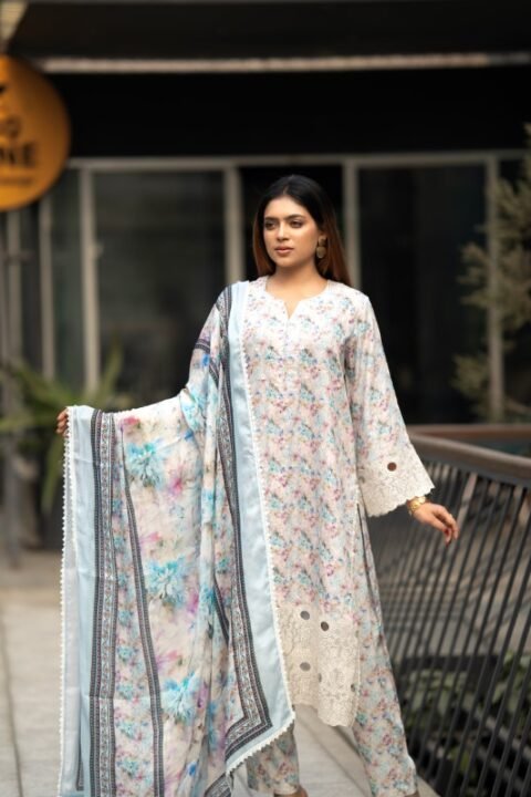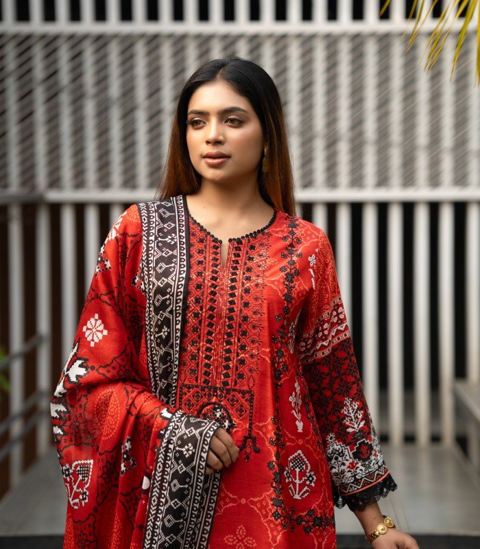 This elegant 3-piece set features delicate manual mirror embroidery on the kameez chest, complemented by attached embroidery on the lower kameez and sleeves. Enhanced with a subtle digital printed design, the coordinated Reon orna completes the outfit, ensuring a graceful and polished appearance for daily wear, office use, or casual outings.