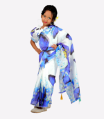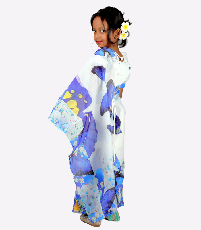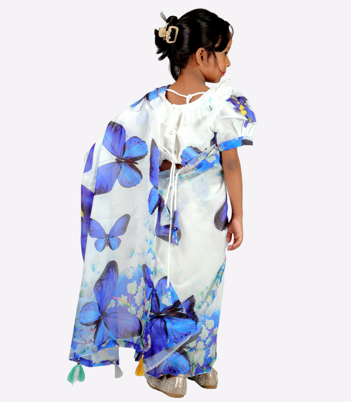 Our Ready Saree for Girls solves this problem by offering a pre-stitched, easy-to-wear option for children aged 0-18 years. The Chanderi Silk Digital Print Saree features a delightful butterfly design in white and blue contrast, making it the ideal choice for any occasion.