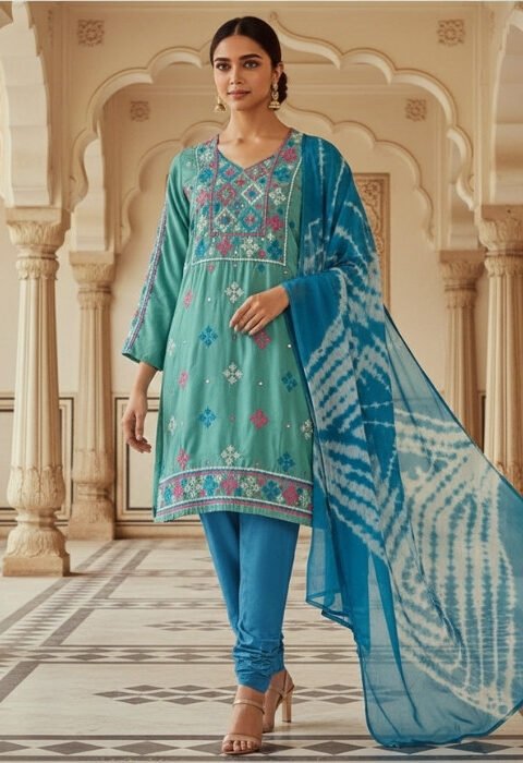 Chanderi Salwar Kameez with Colorful Kantha Stitch and Glass Work – Premium Boutique Three Piece