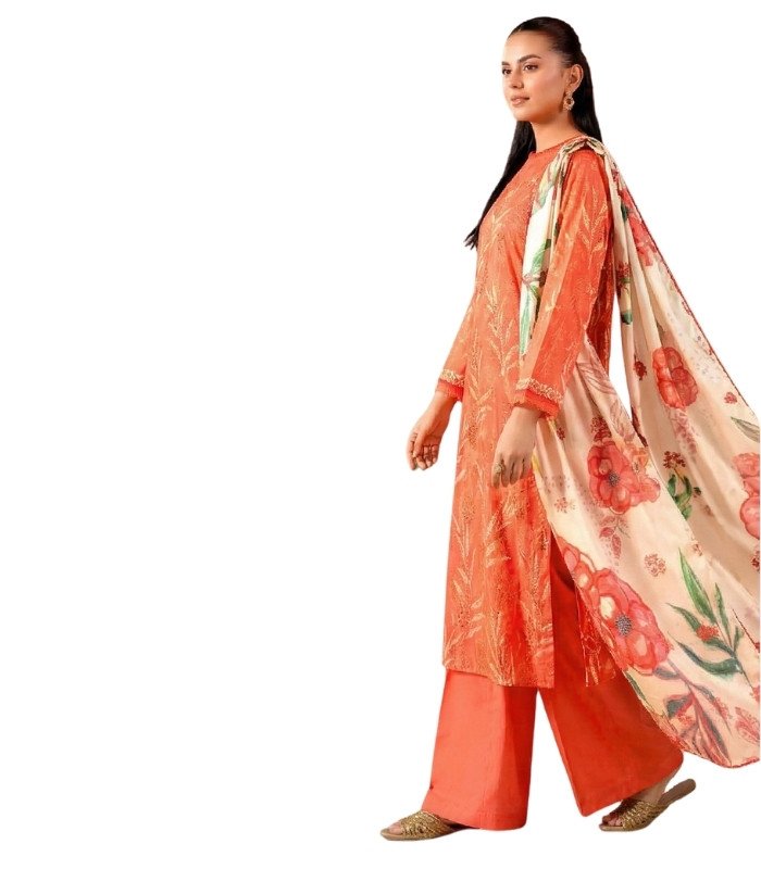 Paired with a solid dyed coral orange trouser, the outfit maintains a clean and balanced look. As an unstitched three-piece salwar kameez, it allows full customization during tailoring and can be styled into modern straight cuts, traditional long kameez designs, or elegant A-line silhouettes.