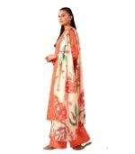 The highlight of this ensemble is the beautifully designed floral printed dupatta. Set on a soft cream base, the dupatta showcases bold red flowers with green botanical stems, creating an artistic contrast that balances the bright coral shirt.