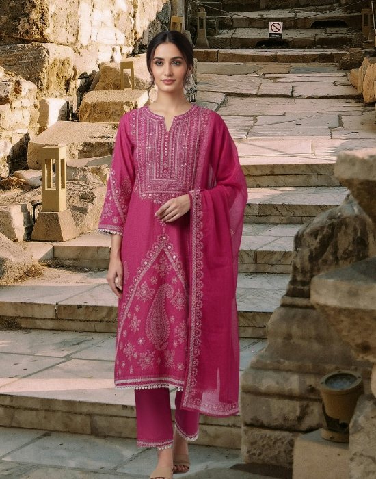 Dark Pink Cotton Three Piece in Bangladesh | Designer Three Piece Buy Online