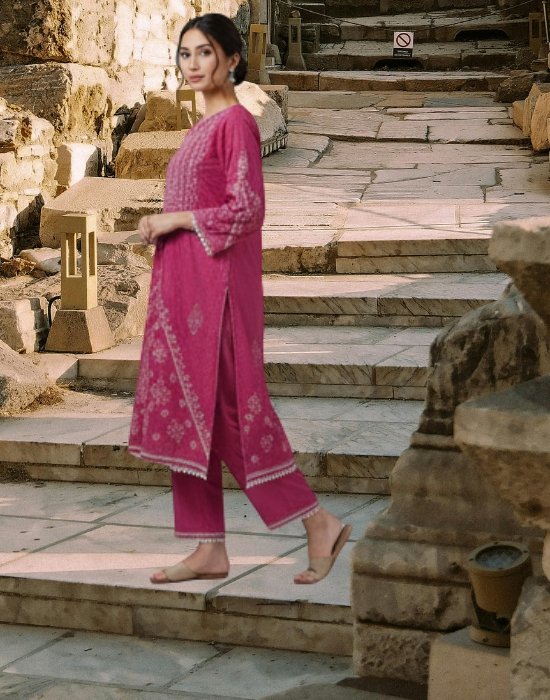 Dark Pink Cotton Three Piece with Block Print and White Chikankari Work – Boutique Designer Set