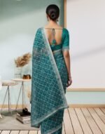 Looking to buy saree online in Bangladesh that combines vibrant color, heritage craftsmanship, and boutique elegance? The Firoza (Turquoise) Muslin Saree with Full Block Print and Barfi Motif Kantha Work is designed for women who appreciate bold artistic design with refined traditional detailing.