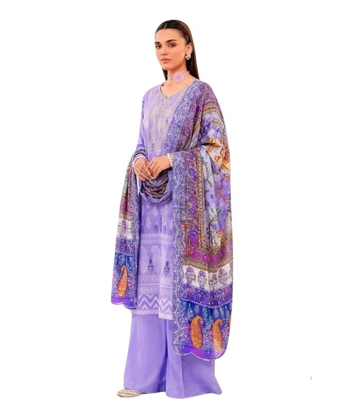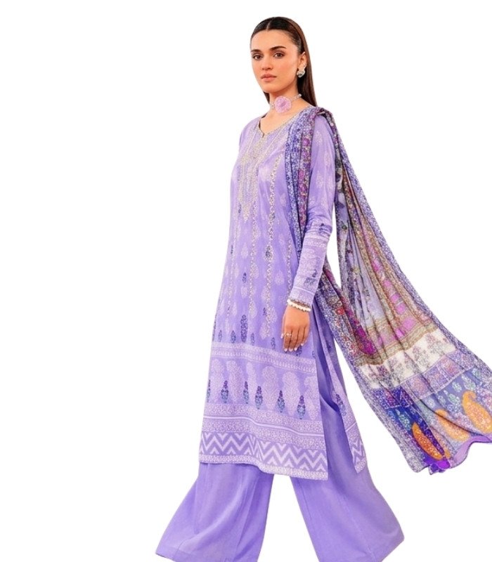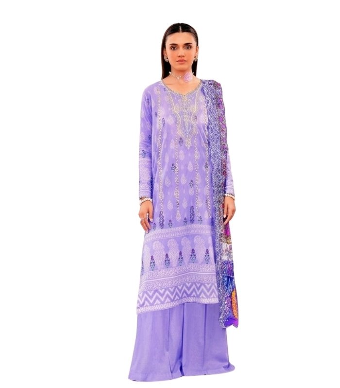 Soft Lavender Embroidered Digital Printed Unstitched Lawn 3 Piece Suit reflects timeless elegance with traditional motifs and border accents. The embroidered neckline and motif detailing add refined ethnic charm.