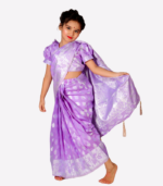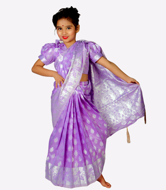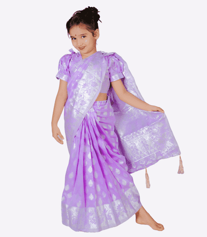 Every light purple Katan kids saree comes with a matching ready-made blouse. The blouse complements the silver thread design, is comfortable for long wear, and is skin-friendly. Custom sizing is available on request to ensure a perfect fit for your child, whether they are a toddler or a teenager.