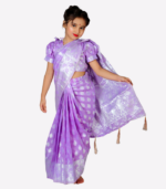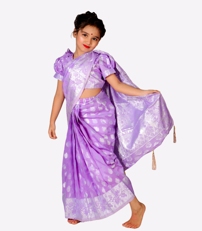 Light Purple Katan Kids Ready Saree with Silver Thread – Hassle-Free Elegance for Girls