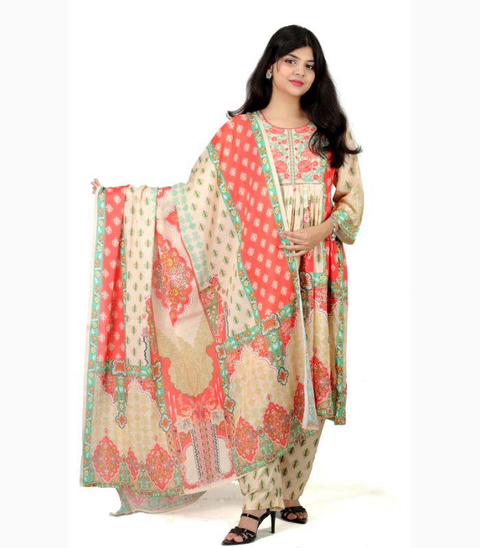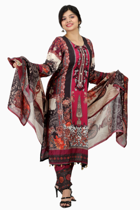 To preserve the vibrant color and embroidery quality, hand wash gently in cold water using mild detergent. Avoid rubbing or twisting the fabric, as this can affect the embroidery. With proper care, this comfortable cotton salwar kameez will remain bright and soft for repeated celebrations.