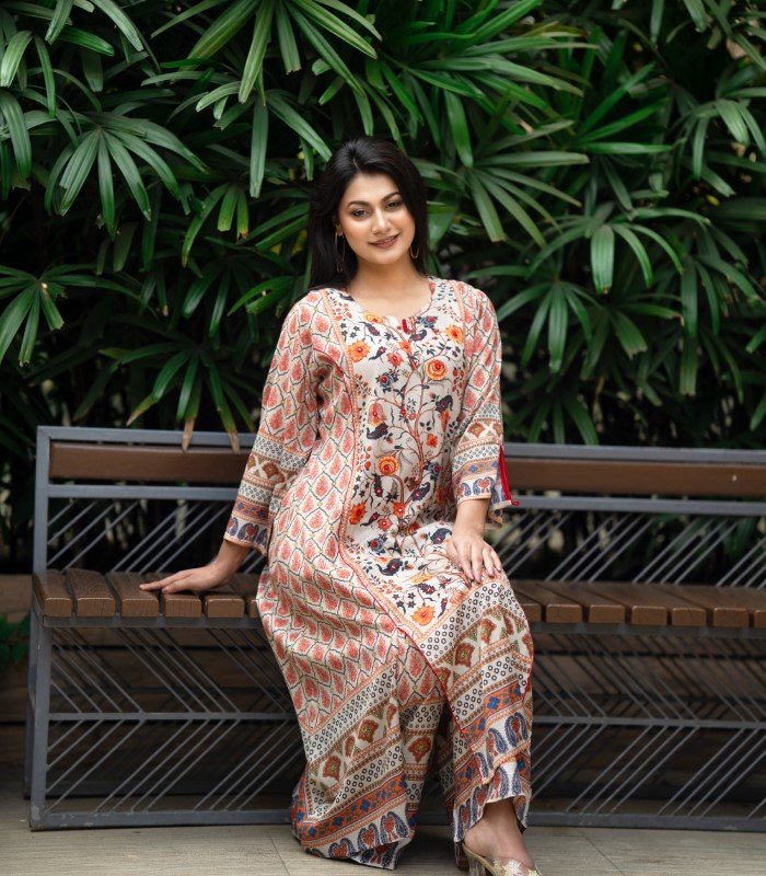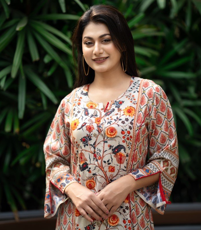 Made from premium Reon / Viscose, the kameez is soft, lightweight, and breathable—perfect for Bangladesh’s warm climate. The chest features sequence embroidery, enhanced by attached embroidery on the lower kameez and sleeves. These delicate details elevate the digital print, creating a refined and feminine look. The matching Reon orna completes the ensemble beautifully.
