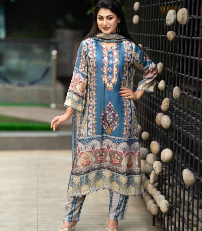 The kameez is crafted from premium Reon / Viscose fabric, chosen specifically for its lightweight texture and breathable quality. In Bangladesh’s warm climate, this fabric helps maintain comfort throughout the day while offering a smooth, elegant drape.