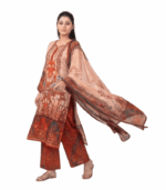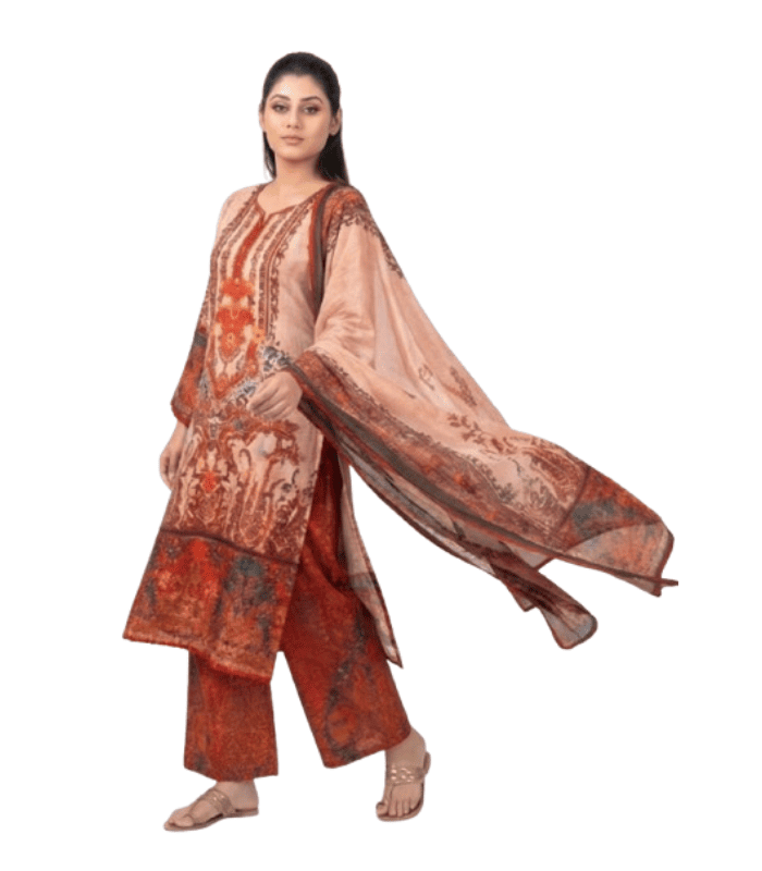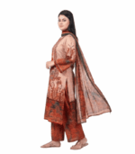 This 3-piece embroidered cotton salwar kameez features delicate embroidery on the chest, enhancing the digital print with a refined and feminine touch. The coordinated Reon orna completes the ensemble, offering a polished and cohesive look suitable for office wear, casual outings, or daily activities.