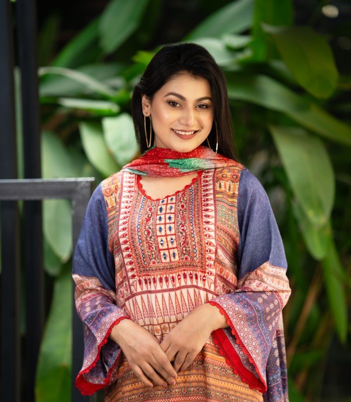 Made from premium Reon / Viscose fabric, the kameez is soft, lightweight, and breathable—ideal for Bangladesh’s warm climate. The delicate manual mirror embroidery on the chest, lower kameez, and sleeves adds sophistication and a subtle festive touch, enhancing the digital print design with grace and elegance. The coordinated Reon orna drapes beautifully over the shoulders, completing the ensemble with traditional charm.