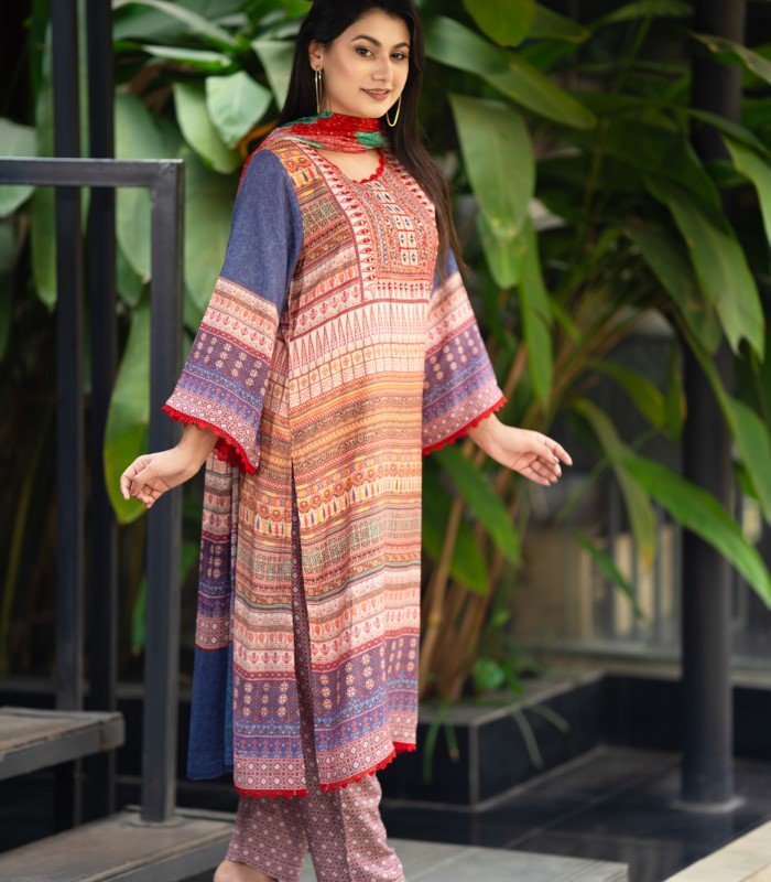 This embroidered cotton salwar kameez is more than just a traditional outfit—it’s a wardrobe essential. The breathable fabric, intricate mirror embroidery, and coordinated 3-piece design make it suitable for multiple occasions, combining elegance, style, and comfort. The sophisticated digital print and subtle mirror detailing create a look that is both graceful and versatile, ideal for women who want a stylish yet practical daily outfit.