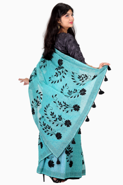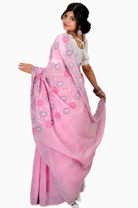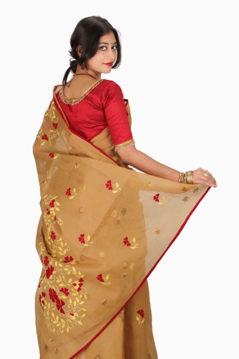 Exquisite Handwork: Karchupi applique embroidery across the fabric and pallu