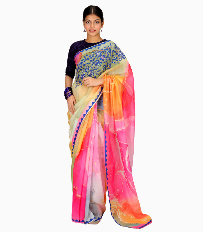 This Multicolor Karchupi Chanderi Saree for Women comes with a designer blouse that complements the saree’s print and embroidery. You can choose a matching or contrast blouse depending on your styling preference. The blouse enhances the saree’s appeal and completes your traditional look. Pair it with minimal jewelry for a subtle appearance or statement accessories for festive occasions.