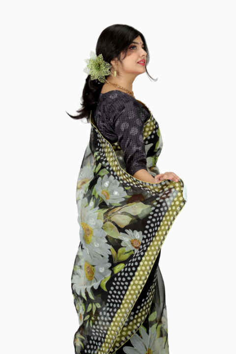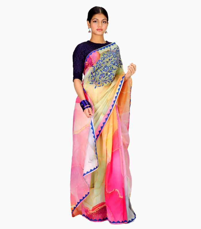 This saree can be styled in multiple ways to suit various occasions. The premium craftsmanship elevates the saree from casual ethnic wear to a designer statement piece. With its vibrant multicolor design and detailed embroidery, it is a must-have for every woman’s ethnic wardrobe.