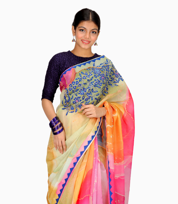 Step into tradition with our Multicolor Karchupi Chanderi Saree for Women, a perfect blend of comfort, craftsmanship, and style. Designed for women who appreciate ethnic elegance, this saree is ideal for weddings, festive occasions, cultural programs, or family gatherings. The vibrant multicolor batik print paired with exquisite Karchupi hand-applique work adds sophistication and charm to your wardrobe.
