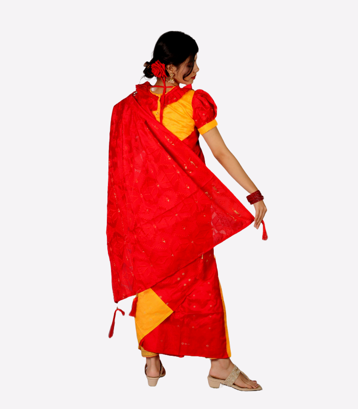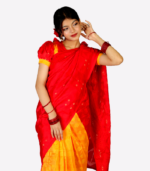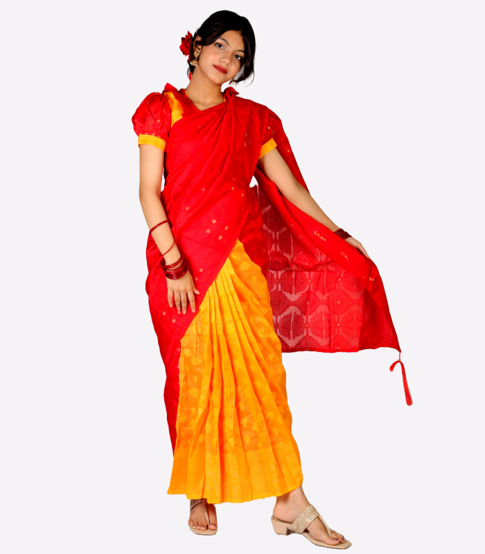 Crafted from high-quality Jamdani fabric, this ready saree is both soft and durable. It’s gentle on your child’s skin and can be worn comfortably in any season—winter or summer—without causing irritation or itching. The beautiful red and yellow contrast creates a striking and cheerful look. We also offer this particular Jamdani design in a range of other stunning colors, including red, blue, yellow, light purple, dark purple, green, and black. The fabric is easy to maintain; just wash it in cold water with detergent, and the colors will remain vibrant and true without discoloring over time.
