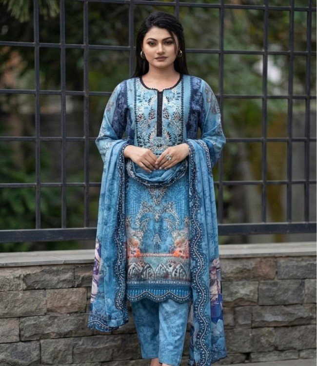 The Nil Komol Salwar Kameez by BD Made Fashion is crafted for women who love a blend of elegant traditional embroidery and everyday wearability. This 3-piece set includes a digitally printed kameez, a matching Reon orna, and a classic AC cotton salwar, forming a coordinated and stylish ensemble suitable for daily wear, office, or casual outings.