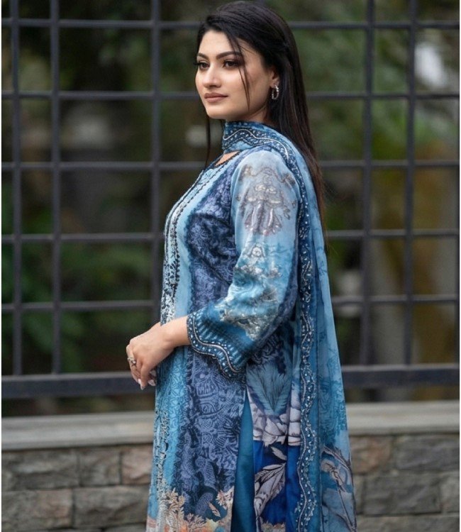 The Nil Komol Salwar Kameez features manual mirror embroidery on the chest, complemented by attached embroidery on the lower kameez and sleeves. A subtle digital printed design adds a modern touch, enhancing the elegance of the outfit. Full sleeves and a round collar complete the classic look, making it perfect for both casual and semi-formal occasions.