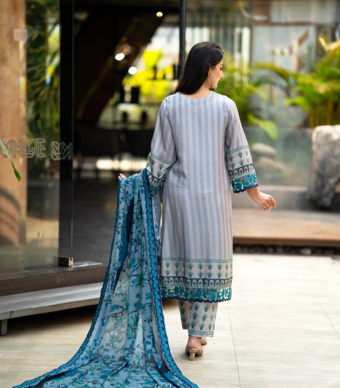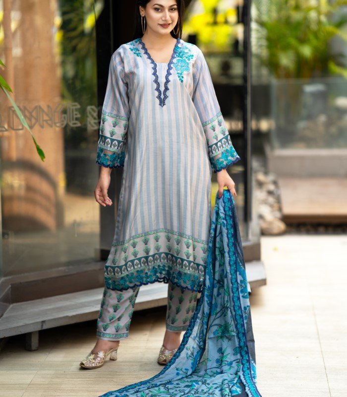 The Niluv Embroidered Cotton Salwar Kameez by BD Made Fashion is crafted for women who love elegance paired with everyday practicality. This exquisite 3-piece set includes a digitally printed kameez, a matching Reon orna, and a classic AC cotton pant—perfect for a polished and coordinated outfit.