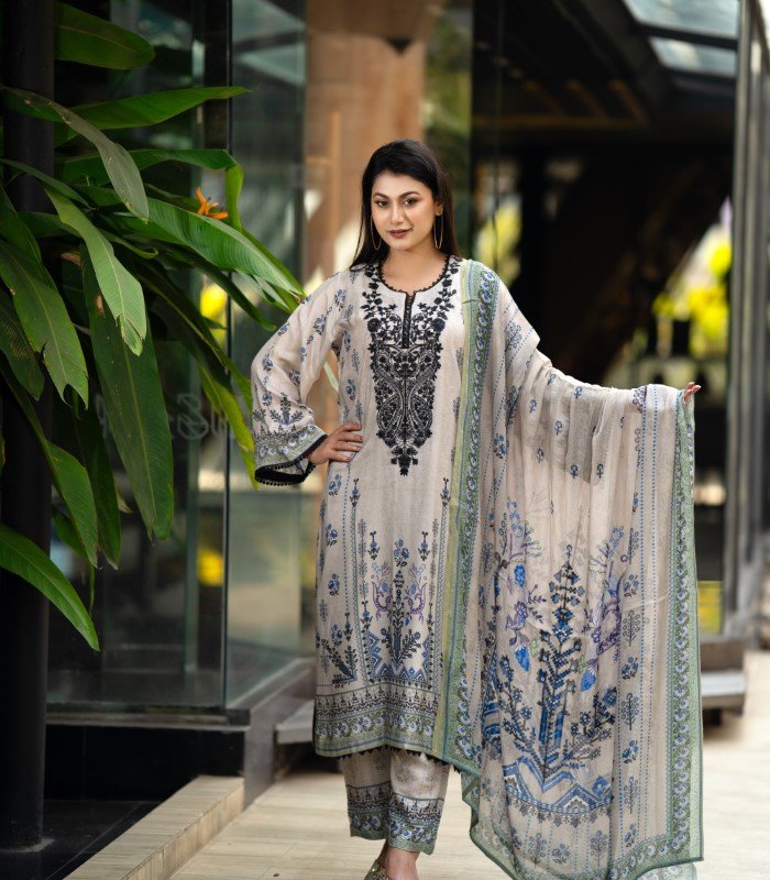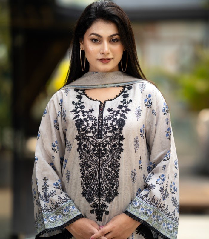 The Noyon Tara Embroidered Cotton Salwar Kameez by BD Made Fashion is crafted for women who appreciate a perfect blend of traditional charm and everyday comfort. This elegant 3-piece set includes a digitally printed kameez, a matching Reon orna, and a classic AC cotton pant—ideal for a coordinated and graceful look.