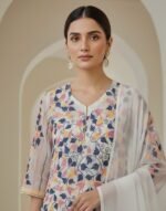 The highlight of this boutique three piece is its all over Kantha work on the kameez. Inspired by traditional hand-stitch techniques, the delicate thread detailing beautifully enhances the off-white base, creating a subtle yet luxurious finish. If you’re searching for an exclusive three piece in Bangladesh that reflects heritage craftsmanship and modern elegance, this is the perfect choice.