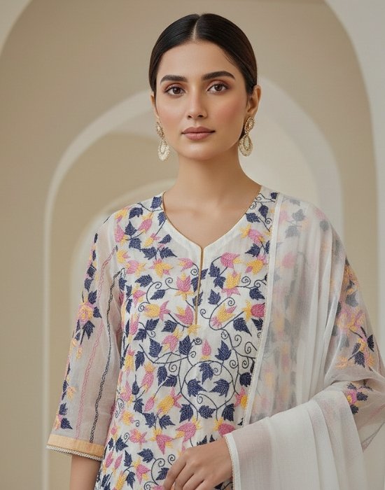 Off-White Muslin Salwar Kameez Set with All Over Kantha Work – Embroidery Boutique Three Piece