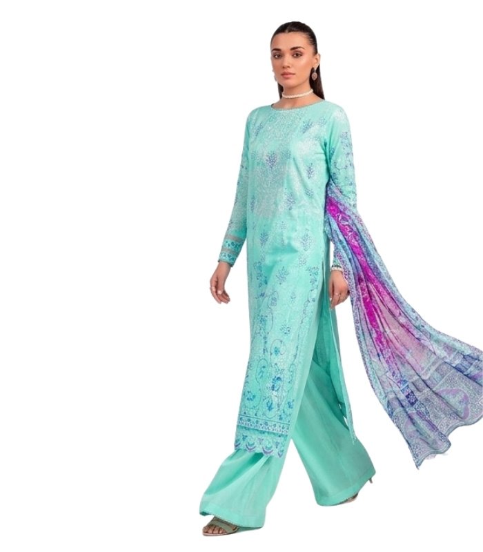 The flowing printed chiffon or silk dupatta enhances its airy appearance, while the light blue dyed cotton trouser provides soft contrast. This unstitched set allows tailoring flexibility for sleeveless, cap sleeve, or full sleeve styling.
