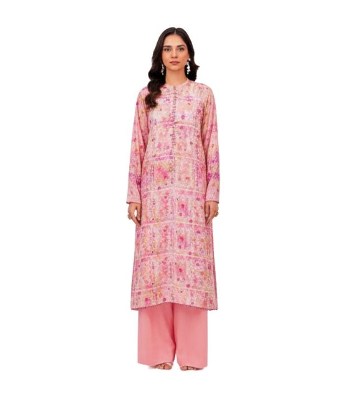 The shirt features artistic digital floral prints arranged across the fabric, creating a lively yet refined appearance. Bright shades of hot pink, rose pink, soft blush and light orange blend harmoniously with the peach background, adding depth and vibrancy to the design.