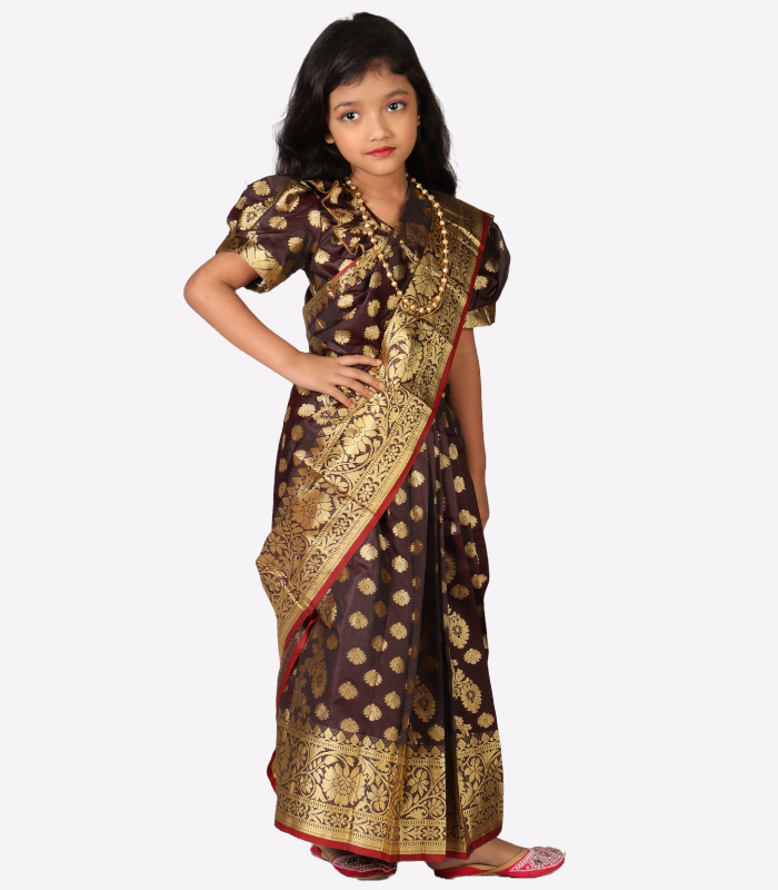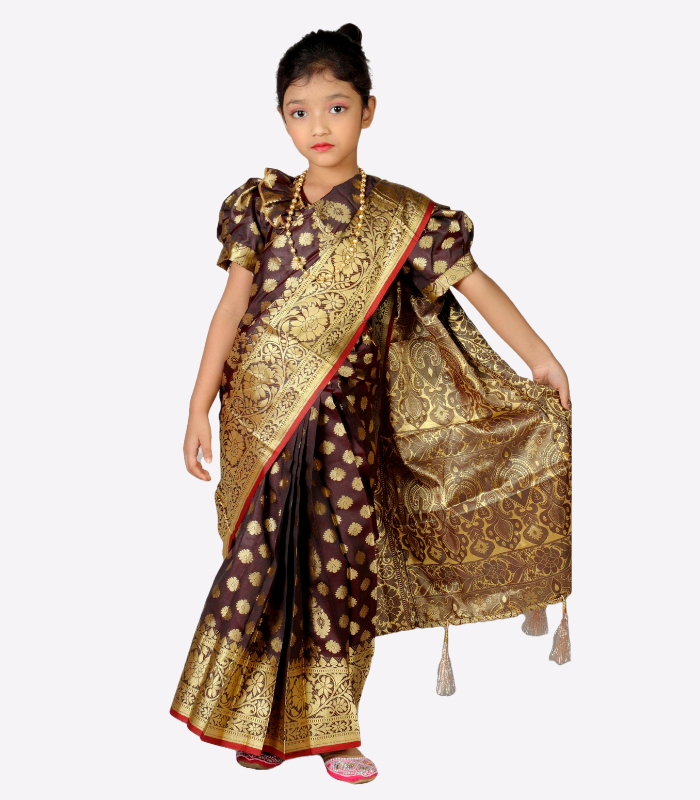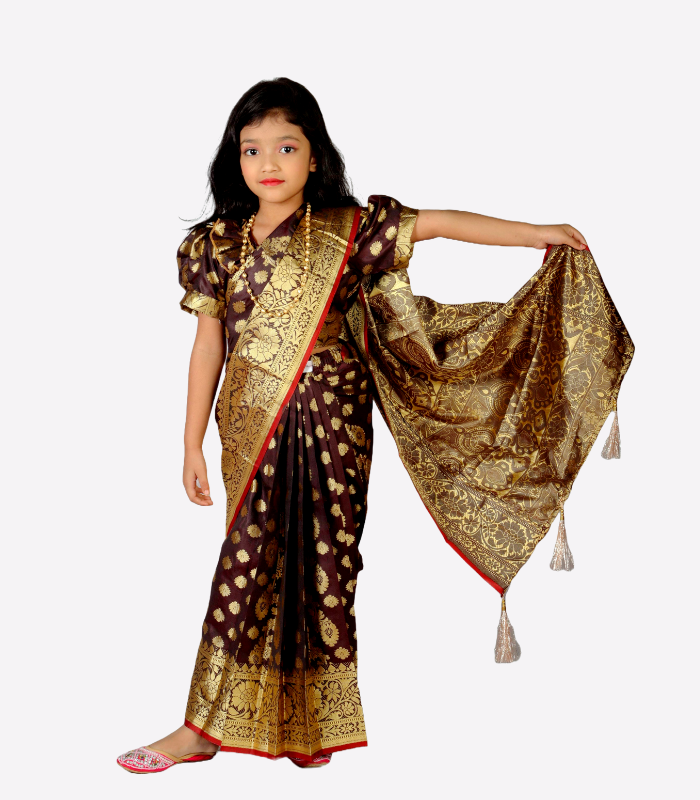The Soft Lota Katan fabric not only feels luxurious but is also highly durable, ensuring your child can enjoy this saree for many events without wear or discomfort.