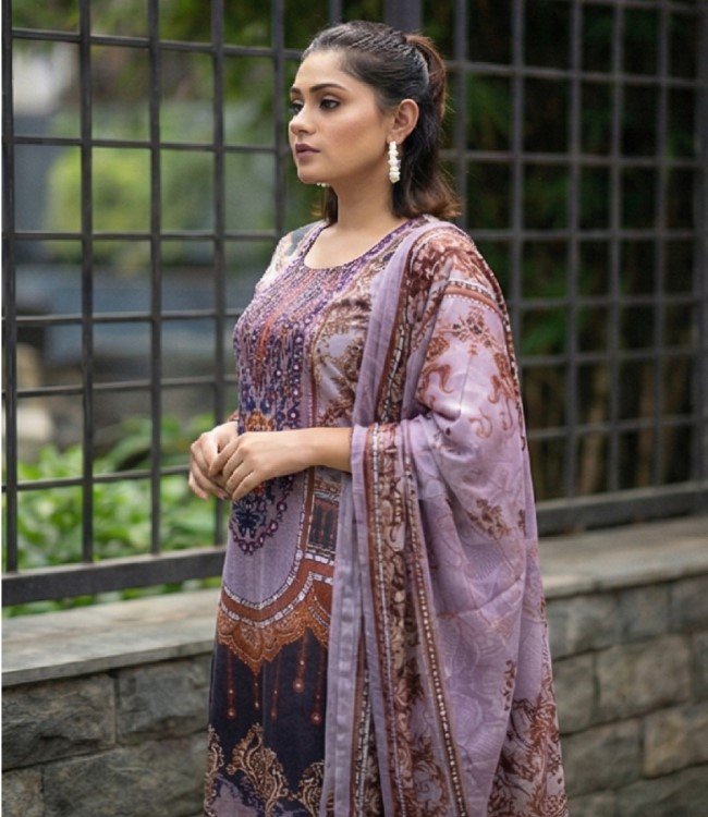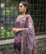 The Piyashi salwar kameez features delicate chest embroidery along with lace detailing on the lower kameez and sleeves, adding a touch of sophistication. Subtle digital prints enhance the traditional look without overpowering the outfit, making it a perfect example of cotton salwar kameez with embroidery for women who want both style and practicality. The coordinated matching Reon orna completes the ensemble gracefully, giving a polished and traditional finish.