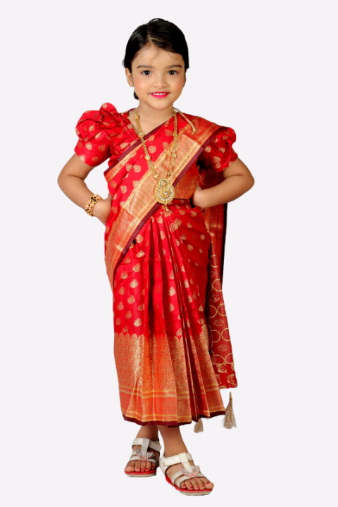 The saree is easy to maintain. A normal wash with mild detergent is enough to keep it fresh and vibrant. With proper care, this saree will remain a long-lasting part of your child’s wardrobe.