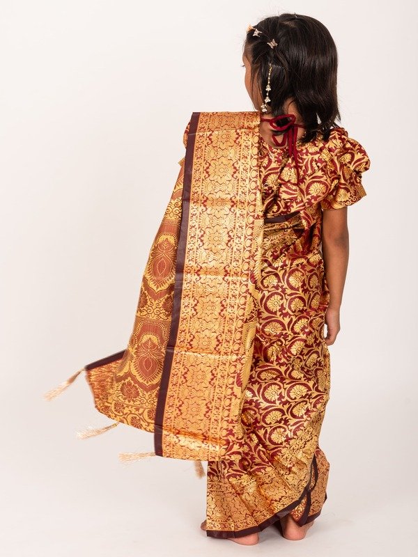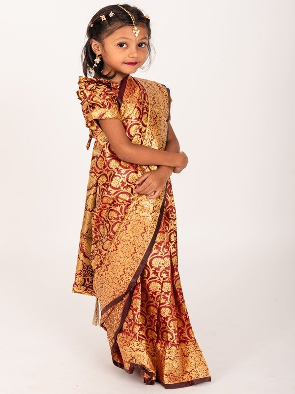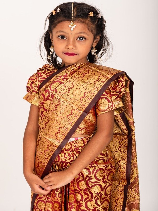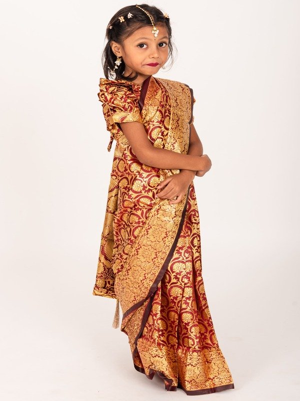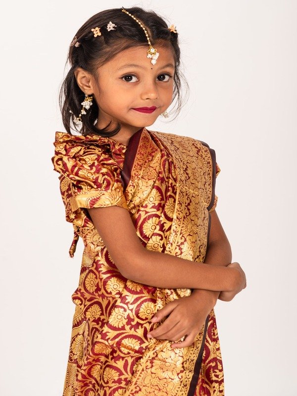Make every celebration special with this Royal Maroon Banarashi Soft Katan Kids Ready Saree. Crafted from soft Katan silk with traditional Banarashi weaving, this saree offers a rich festive look.