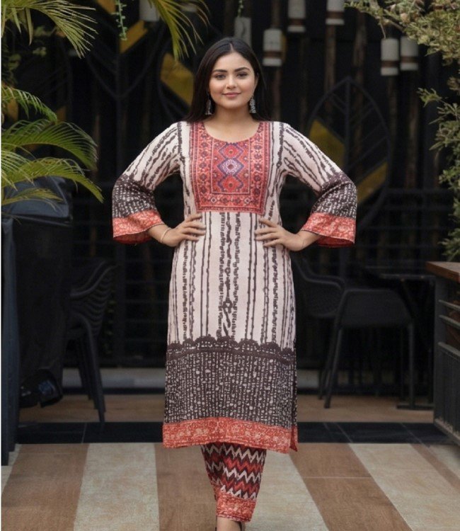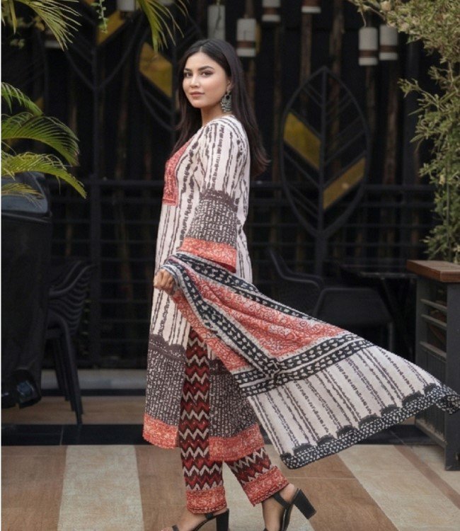 A: Kameez is made from premium Reon/Viscose, Orna is Reon, and Salwar is AC Cotton for a soft, comfortable fit.