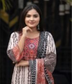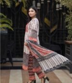 Featuring delicate manual embroidery on the kameez chest, this digitally printed 3-piece set adds a sophisticated and polished look. The lower kameez and sleeves are enhanced with subtle embroidery, while the coordinated Reon orna completes the ensemble beautifully.