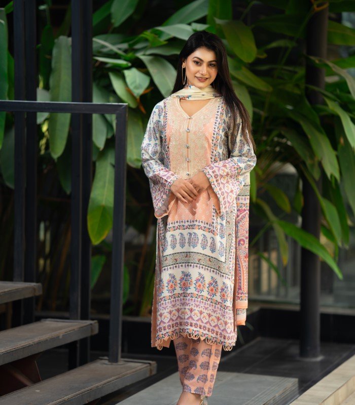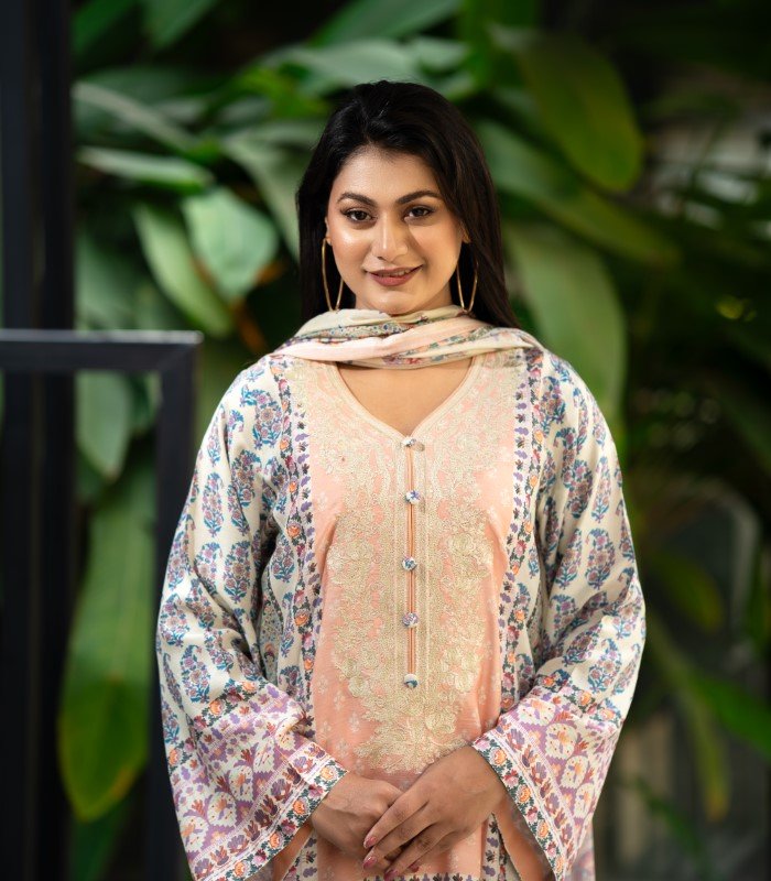 Crafted from premium Reon / Viscose fabric, the kameez is soft, lightweight, and breathable—ideal for Bangladesh’s warm and humid climate. The chest features delicate embroidery that enhances the digital print without overpowering the design. Subtle embroidery on the sleeves and lower kameez adds sophistication and elegance, giving this outfit a refined, polished look.